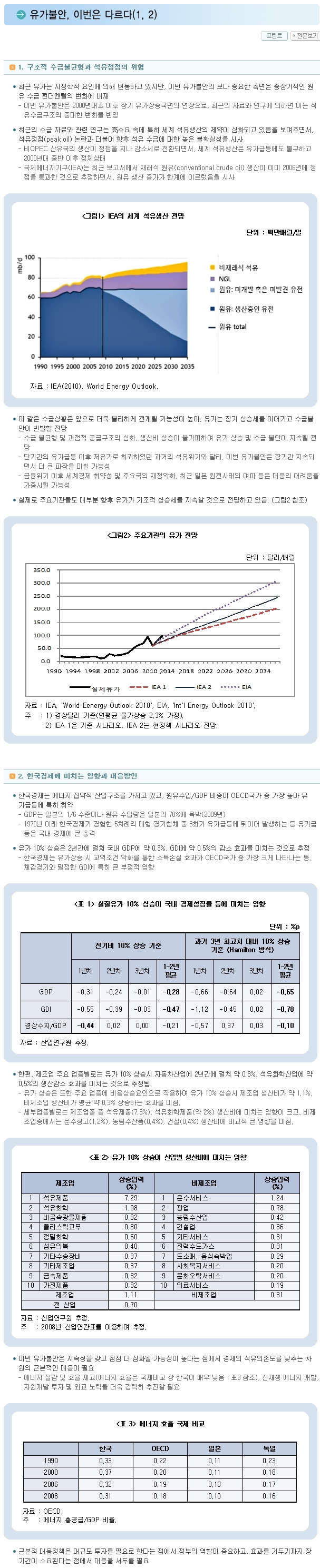 산업연구원에서 매우 의미심장한 연구자료를 내놨다. 연구자료는 유가상승에 따른 석유수급에 관한 연구를 모니터링하고 연구한 결과 금번 유가 불안은 석유정점(oil peak)에 기인한 바가 크고, 석유시대가 저물어가고 있다는 내용인데, 산업보호와 산업계의 입장을 대변해왔던 국책연구원에서 이런 연구를 내놨다는 것만으로도 충격적인 일이다. 또한 자료에서 언급하고 있는 IEA나 IMF 등 역시 재래식 원유의 정점이 이미 2006년에 지났거나 지나고 있다라는 의견으로 조속한 대응의 필요성을 역설하고 있다.