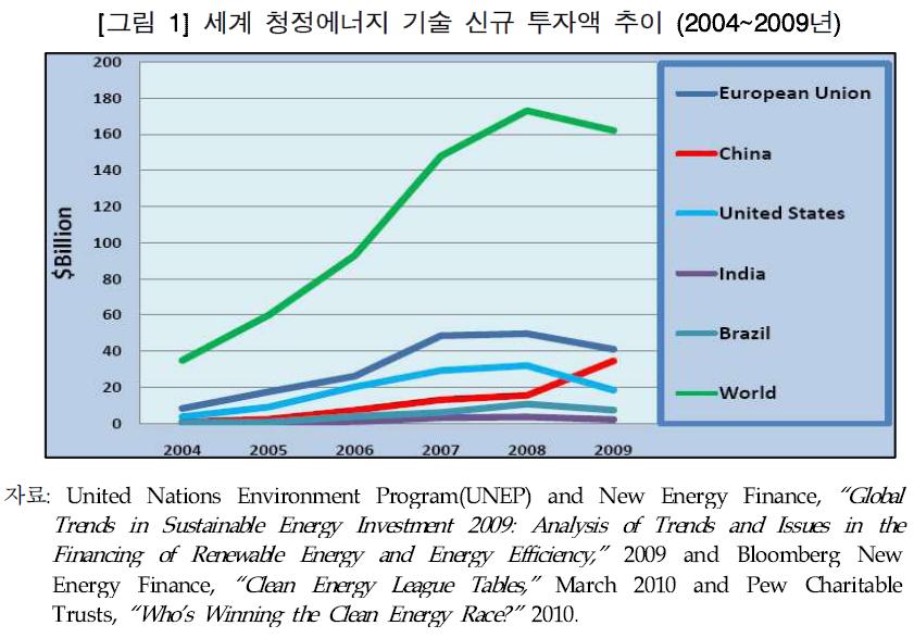 ○ 중국, 유럽 및 여타 국가들은 자국 고유의 청정에너지 산업을 구축하고 시장점유율을 확대하기 위해 노력을 강화하고 있으며, 현재 청정에너지 기술 시장의 약 90%는 아시아와 유럽이 점하고 있음.