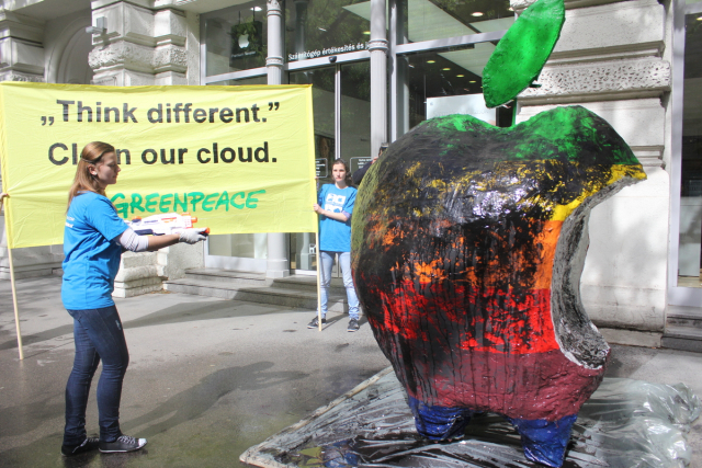 ▲그린피스 활동가들이 애플 스토어 앞에서 애플의 미온적인 재생에너지 전환 등을 규탄하는 캠페인을 벌이고 있다. ⓒ그린피스