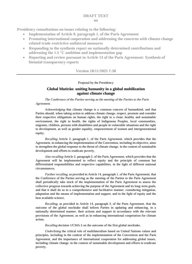 의장국 브라질 정부가 제안하는 협상문 초안(Belém Political Package) 갈무리 @ UNFCCC(링크 참고)