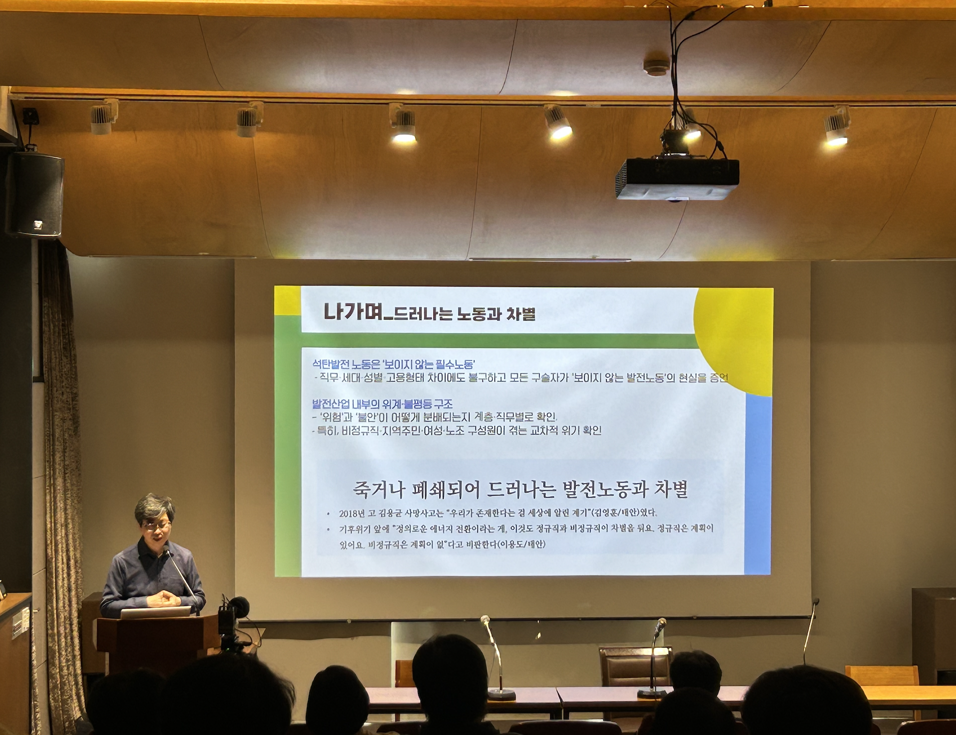 공유회에서는 한재각 연구책임자의 연구 결과 발표에 이어, 태안과 하동 발전소에서 일해 온 김영훈, 김영구 노동자와 이야기를 나누는 시간을 가졌습니다. 구술 인터뷰를 진행하며 우리는 숫자와 통계로는 결코 담아낼 수 없는 노동자의 삶_위험과 불안, 자부심과 보람에 대해 알게 되었고 함께 살아갈 전환에 대해 다시 생각하게 되었습니다.