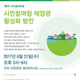 제6차시티솔라포럼 '시민참여형 태양광 활성화 방안'을 아래와 같이 개최합니다.이번 포럼에서는 태양광 협동조합, 태양광 시민펀드, 개인프로슈머 등 시민참여형 태양광 보급 활성화를 위...