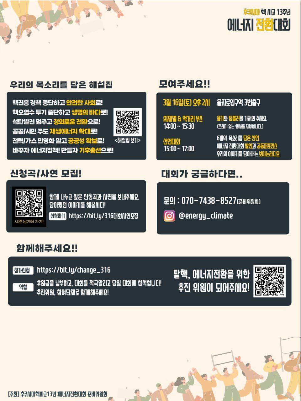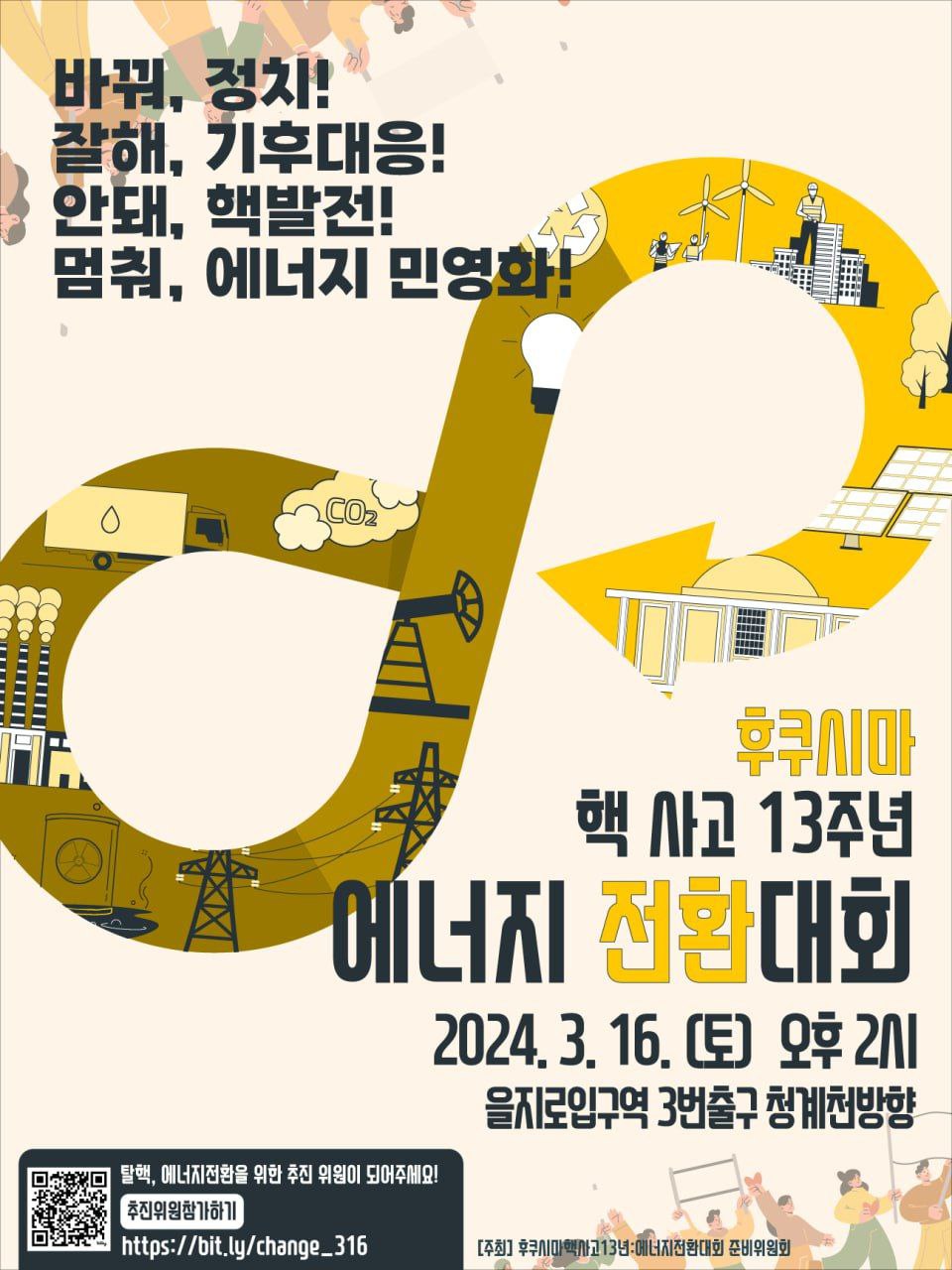 후쿠시마 핵사고 13주년과 4월 총선을 앞두고 탈핵, 기후정의, 에너지 공공성, 정의로운 전환을 바라며 행동하는 모든 개인과 단체들의 참여를 바랍니다.