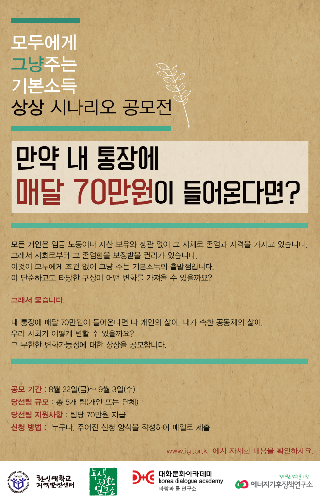 그래서 묻습니다. 내 통장에 매달 70만원이 들어온다면 나 개인의 삶이, 내가 속한 공동체의 삶이, 우리 사회가 어떻게 변할 수 있을까요? 그 무한한 변화가능성에 대한 상상을 공모합니다.