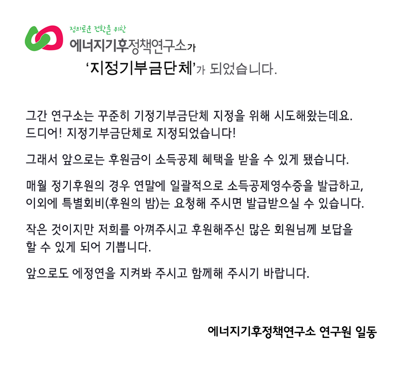 에너지기후정책연구소가 '지정기부금단체'가 되었습니다.
